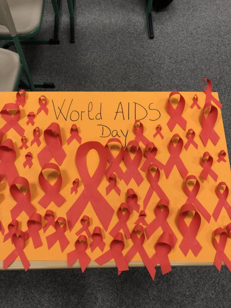 Weltweit leben knapp 41 Millionen Menschen mit HIV. In Deutschland lebten Ende 2023 nach Schätzung des Robert Koch-Instituts knapp 97.000 Menschen mit HIV. Die Schüler bastelten aus Papier rote Schleifen. Die Rote Schleife steht weltweit für Solidarität mit Menschen mit HIV und an AIDS erkrankten Menschen.
